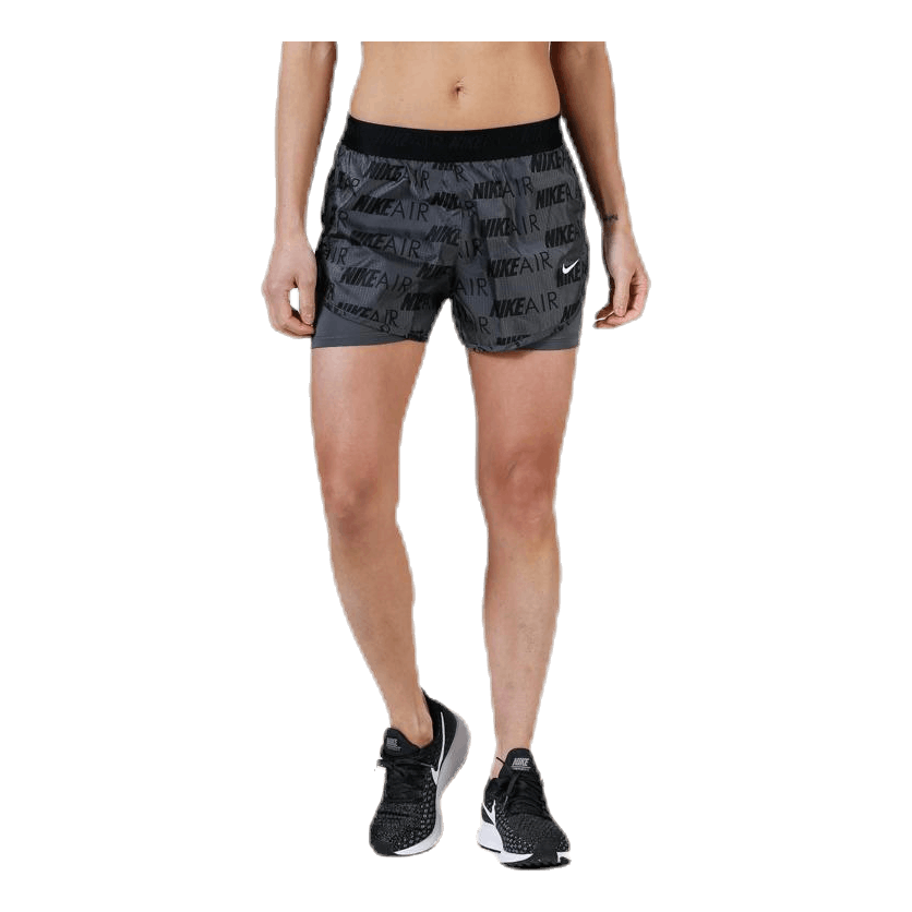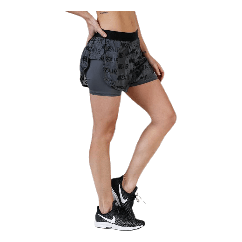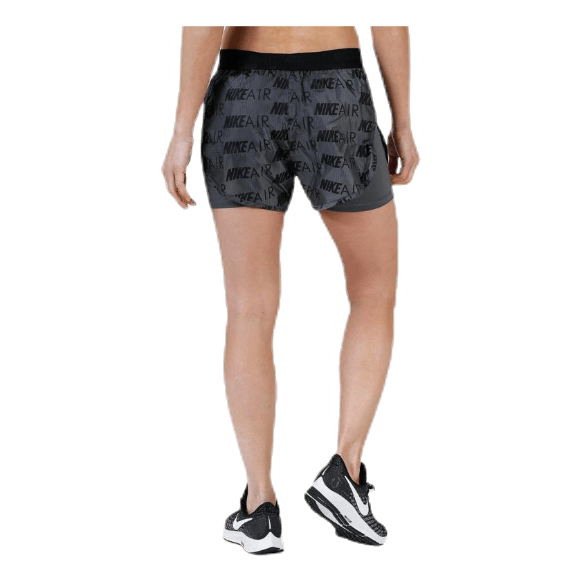 Slapp av i Nike Air løpeshorts for kvinner. Innershortsen bidrar med en kompresjonsfølelse og svettefjernende beskyttelse, mens det trykte, gjennomsiktige stoffet på yttershortsen føles glatt og lett. Høye sidepaneler gir deg fri bevegelse.