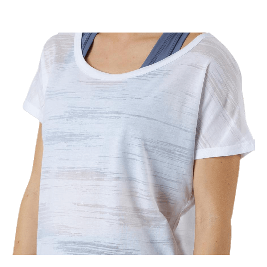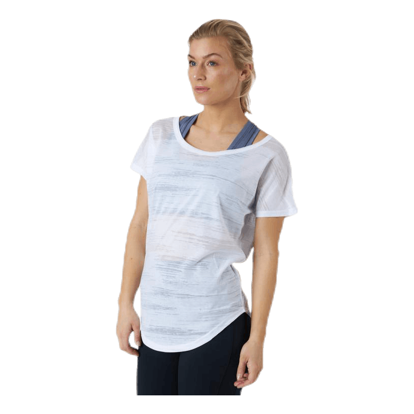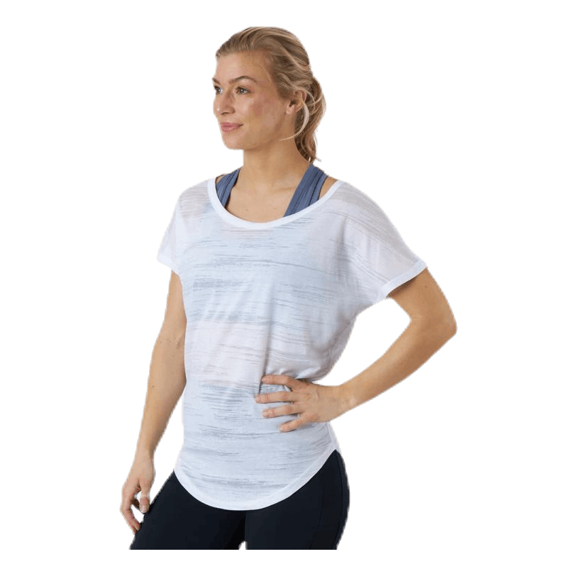 T-skjorte som passer like godt på kvelden yoga økten eller morgen trening i treningsstudioet, denne tee er laget av et utbrent trikotasje for et skarpt utseende. Modellen har en rund halsringning, ermer og løs passform.
